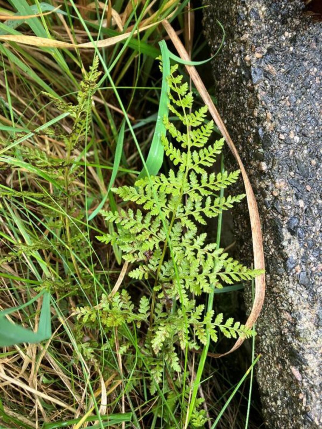 We next visited the old kirkyard which adjoins the old church which has been closed and for sale for a number of years. Some of the plants here were typical of old grassland like Pignut Conopodium majus, Common Knapweed Centaurea nigra and Common Bird’s-foot-trefoil Lotus corniculatus. Others occupied niches that the stonework offered. Most interesting probably was the Brittle Bladder Fern Cystopteris fragilis that Bob found. This was only the second record for this lowland Hectad the last being 1969 or earlier. Shrubs of interest were Hollyberry Cotoneaster Cotoneaster bullatus and Wall Cotoneaster Cotoneaster horizontalis, Garden Privet Ligustrum ovalifolium and Wild Plum Prunus domestica that is suckering and slowly advancing from the edges.