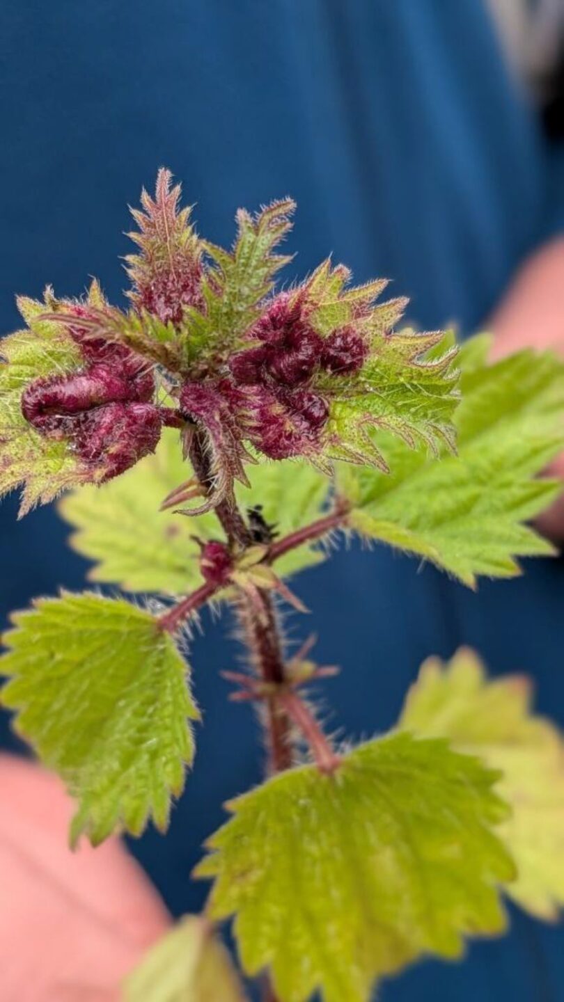 We returned for lunch in the cars to avoid the last of the heavy showers. After this we worked our way to the south end of the village. The road going south passes by Carlyle’s house where the Ecclefechan Burn runs in an old culvert. Here on the stonework there was Shining Cranesbill Geranium lucidum Wild Strawberry Fragaria vesca and Reflexed Stonecrop Petrosedum rupestre. The large Walnut Juglans regia tree by the burn where it goes under the road is an unusual sight and only the seventh recorded in the county. The road continues and goes under the motorway at the edge of the square and a minor road leads to Mein Bridge and the Caravan Park. On the verges here we continued to find new things. Among these were Hedge Mustard Sisymbrium officinale, Hairy Tare Ervilia hirsuta, Mugwort Artemisia vulgaris and Cut-leaved Crane’s-bill Geranium dissectum. We puzzled over a Willowherb growing at the edge of the pavement. This had the large pink flowers of Great Willowherb Epilobium hirsutum but was a short green leaved plant. Closer examination though showed good four lobed stigma and viable seed production so maybe a plant regrowing late in the season after being cut or damaged. The verge also had a nettle with an infection that Alison Robertson tracked down as Dasineura urticae caused by a midge.